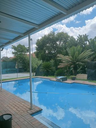 Step outside to embrace a lifestyle of leisure and entertainment. The property offers a large, sparkling swimming pool, ideal for cooling off on warm days. Adjacent to the pool, a spacious covered patio and lapa area provide an excellent setting for outdoor dining or simply unwinding amidst the lush, green garden and established palm trees. The outdoor space is further enhanced by attractive paving, creating a cohesive and appealing environment.