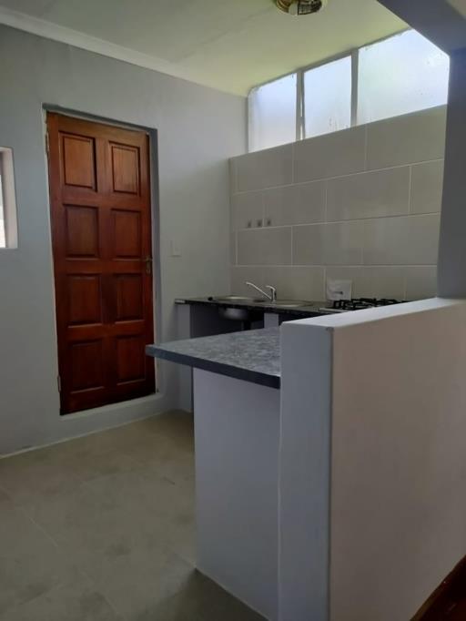 This inviting home is thoughtfully designed for efficient living, featuring a combined lounge area and a well-appointed kitchen. The interior is bathed in abundant natural light flowing through multiple windows and is finished with practical, modern tiled flooring throughout, ensuring a clean and bright aesthetic. The functional kitchen has been upgraded with a new countertop and sink, offering a practical space for meal preparation, complemented by a tiled backsplash. Adjacent to the living area, the property includes a full bathroom equipped with a pedestal sink, mirror, and a corner shower unit, providing all essential amenities.