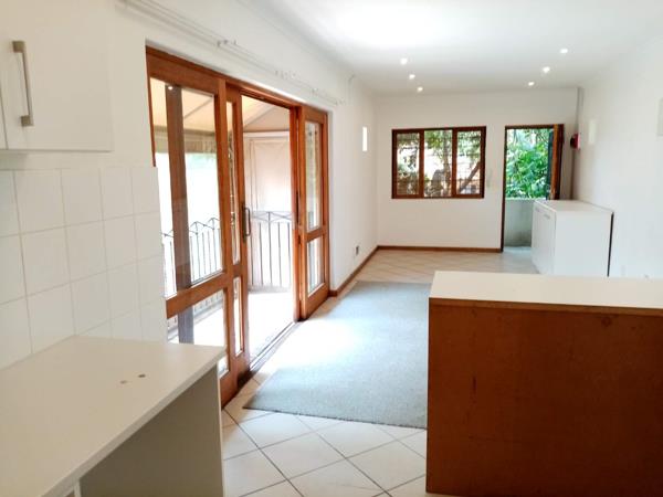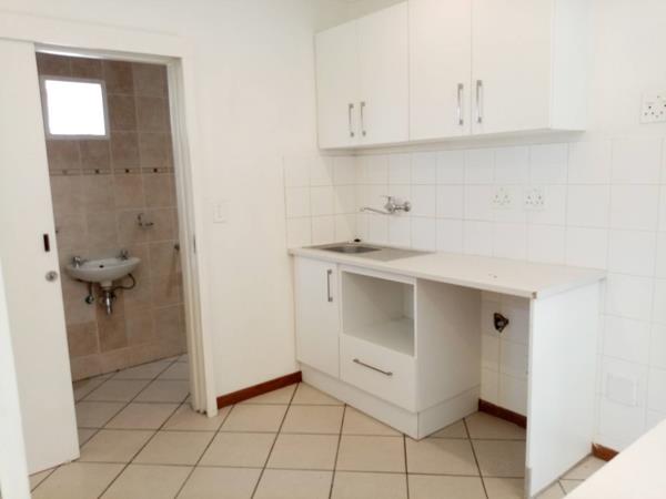 The cottage features a spacious open-plan kitchenette and living area, fully tiled with ample built-in cupboards. The living area opens to a balcony with adjustable awnings, accessed through wooden and glass sliding doors. The kitchen has ample cupboard and counter space, room for a single-door fridge, and one water appliance. Note that there is no built-in stove you will need a 2-plate stove, countertop oven, or air-fryer. The bathroom has a shower only. The entire unit is fitted with downlights, and security includes burglar bars and a security gate.