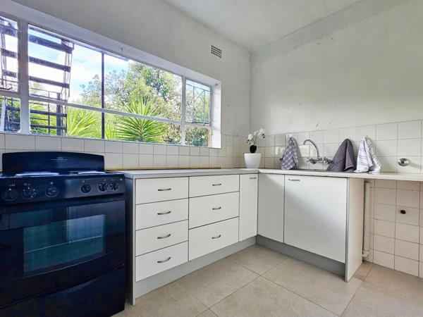 The kitchen has been thoughtfully updated and offers ample cupboard space. It is equipped to accommodate both a washing machine and a double door fridge, combining functionality with style.