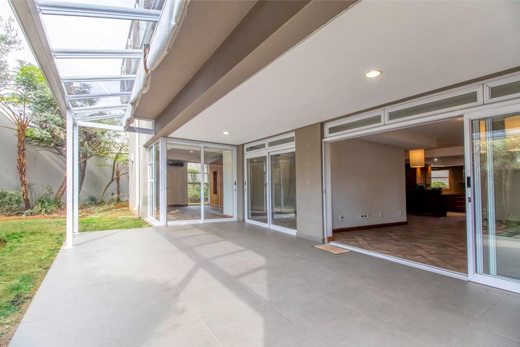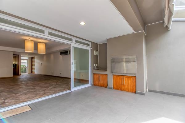 Main bedroom is spacious and has a walk in dressing room in the ensuite full bathroom with double vanities. Bedroom 2 and 3 share a bathroom with a shower in the bath. There is also a guest toilet. The patio is spacious under roof with a built in gas braai and an additional retractable awning. This leads to a landscaped garden that is easy to maintain.