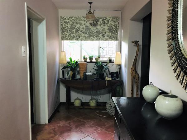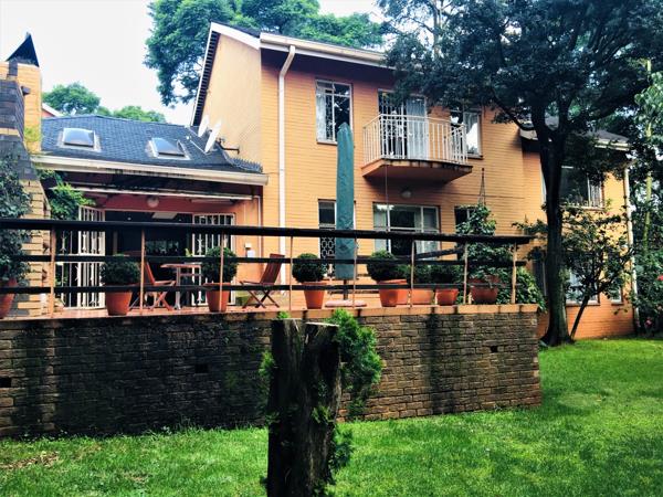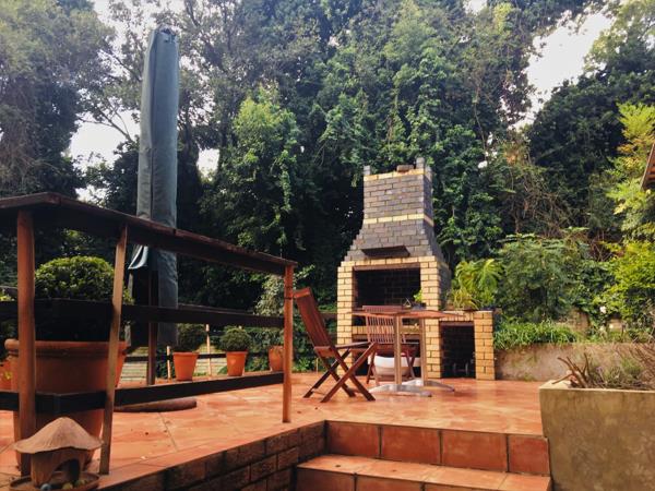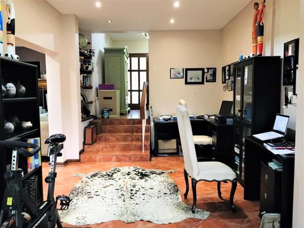 This beautiful, secure and spacious north-east facing home offers the perfect lock up and go experience. Front door welcomes you into a hallway with cupboard lined passage leading to the kitchen, pantry, laundry room with space for washing machine and tumble dryer or dishwasher and courtyard with own washline. Large patio area with braai and back garden lead you into the dining room presenting 2 ceiling sky-lights, 2 fire places and open plan kitchen area sporting gas counter hob and oven, centre island, space for fridge and loads of cupboard space. Lounge is private with views over the garden. Open plan area leading from the lounge is large enough for an office for work from home scenario. Steps lead back to the front door and guest toilet. Stairway leads to first landing and bedroom with multiple cupboards and en-suite bathroom with walk in glass shower. Stairway leads to second landing and bedroom presenting 2 walk-in closets and full en-suite bathroom, Juliet balcony and view of the garden below.