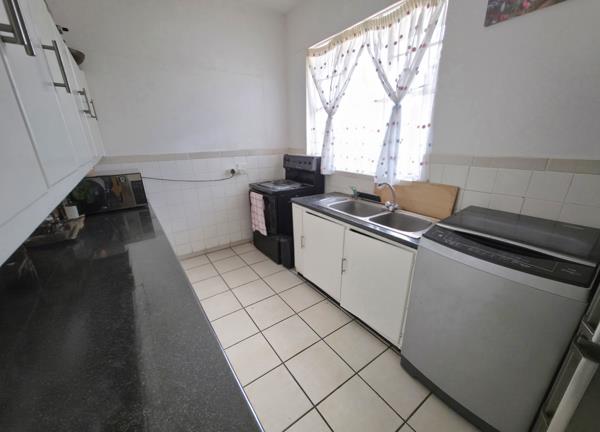 The master bedroom with lots of storage space, The bathroom has a bathtub and hand basin. The kitchen has lots of storage space, and connection for washing machine.