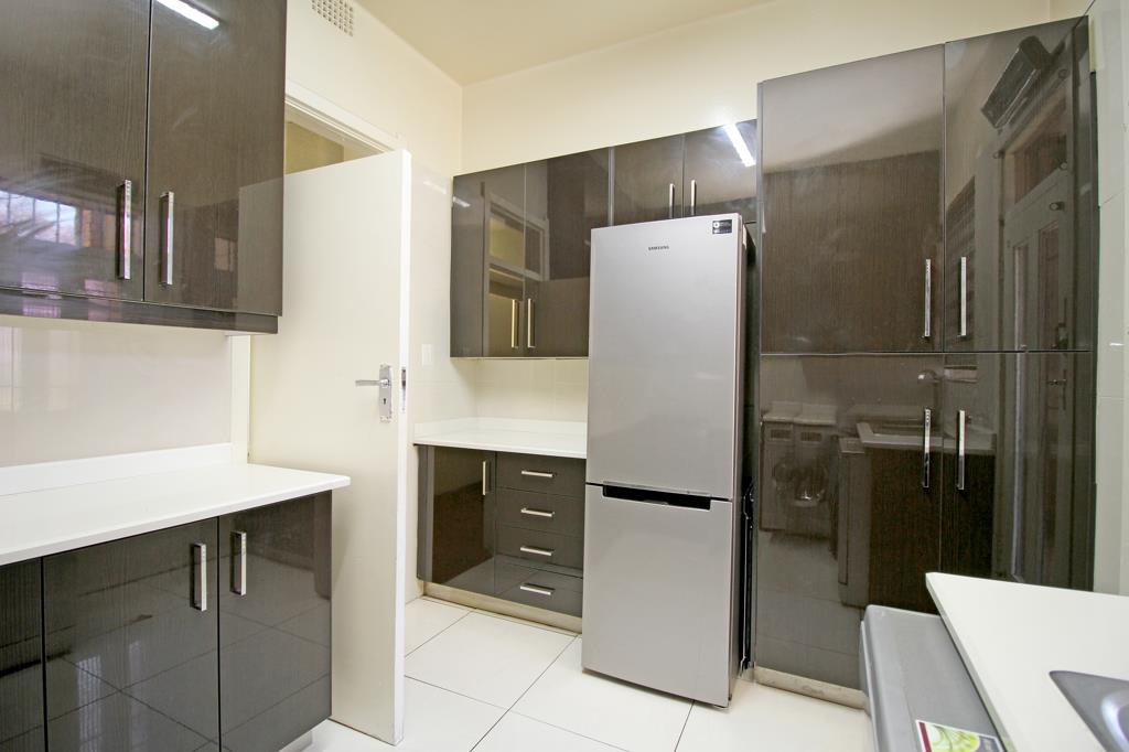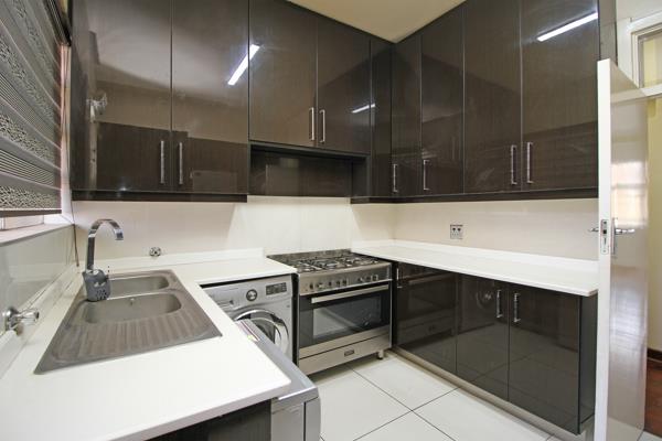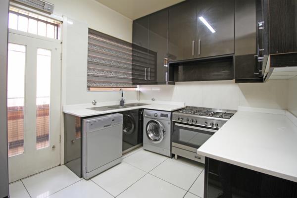 Separate modern kitchen with an ELBA gas stove, Caesar stone tops, space for appliances. Generous amount of wall and under counter space cupboards space.