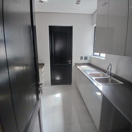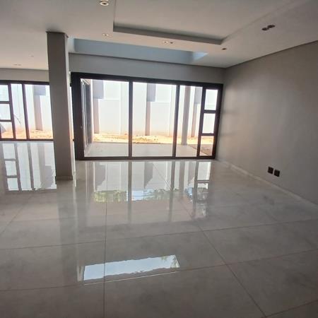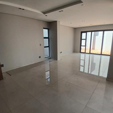 The meticulously crafted interior boasts an open-plan design, seamlessly connecting the lounge and dedicated dining room and a comfortable familyTV room upstairs. The heart of the home features a state-of-the-art kitchen, showcasing sleek, glossy light-toned cabinetry, dark contrasting countertops, a generous island with an integrated sink and a built-in oven. A separate scullery and pantry enhance functionality, catering to every culinary need. Ascend to the upper levels via a striking floating staircase with elegant glass balustrades, a true architectural statement. This magnificent property comprises four lavish bedrooms, each accompanied by its own onsuite bathroom, ensuring ultimate privacy and comfort. Abundant natural light floods the interiors through large glass doors and windows, illuminating the pristine glossy tiled flooring and neutral walls. Outdoor living is effortlessly accommodated with a private balcony and patio, complemented by a well-maintained garden and paving.