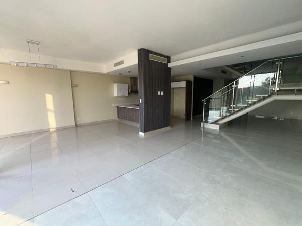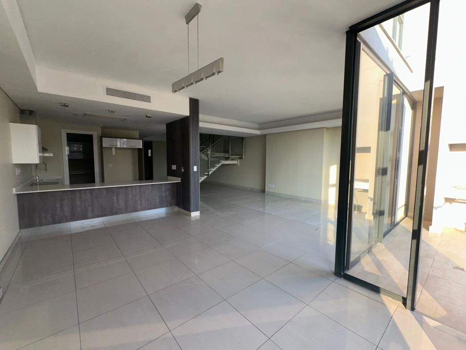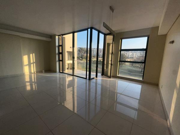 Open plan living dining area leading out to a balcony with a view overlooking the greens