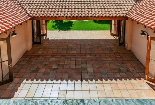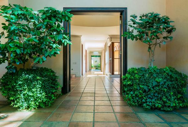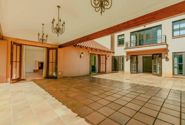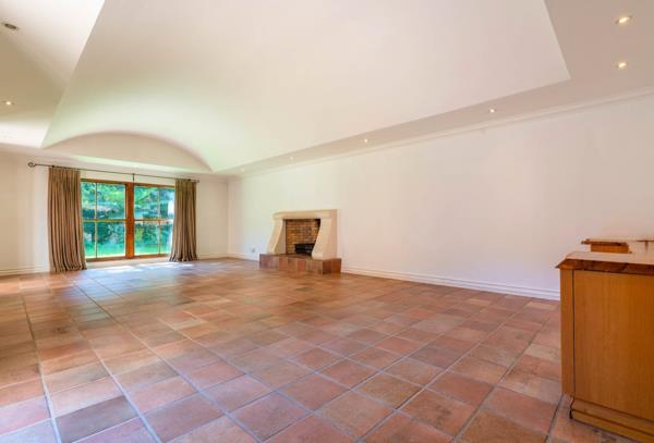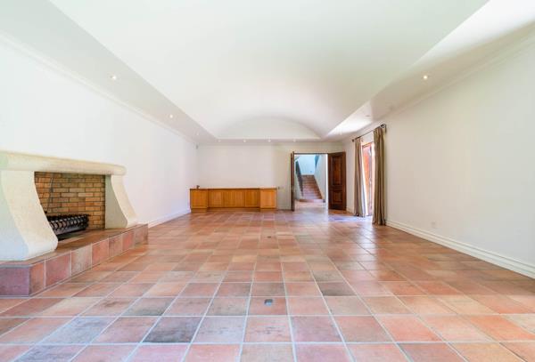 Tiled lower level offers a warm living room with fireplace opens onto central courtyard and, in turn, onto the lush garden and swimming pool.