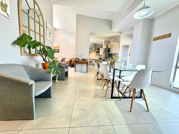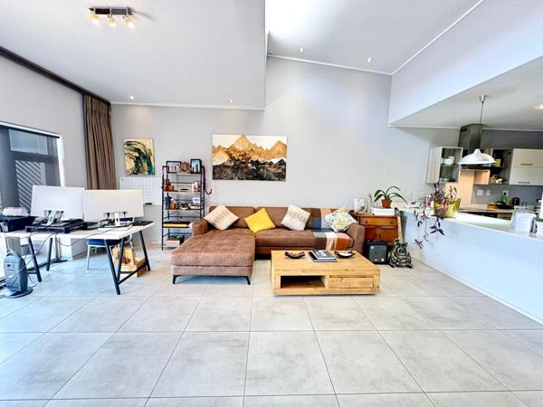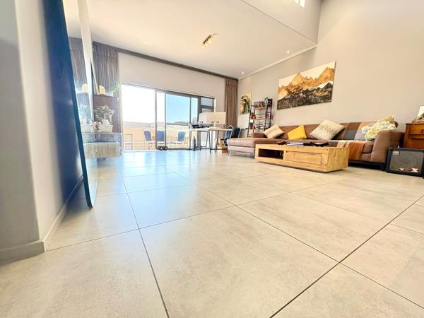 The open-plan living area seamlessly combines the dining room, lounge, and kitchen under a striking double-volume ceiling, creating a bright and airy space. The lounge extends to a private balcony, perfect for morning coffee or evening relaxation.