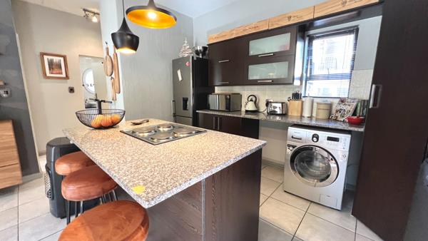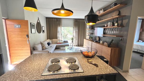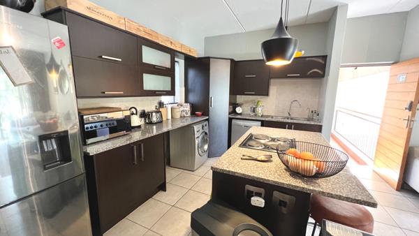 This well-appointed apartment is perfect for upmarket living with its contemporary open plan lifestyle offering modernity and comfort with its lovely furnishings and dcor. The living area is made up of a stunning fully equipped stone top kitchen with a central island with stools to eat meals at or sit around whilst cooking meals with guests. The kitchen is open plan to the fabulous lounge with a solid wood wall unit and ample space to add to the luxury lifestyle. The lounge opens onto a lovely balcony to enjoy outside lunches or morning coffee. The passage separates the living area from the two private well sized bedrooms. The main bedroom opens onto the balcony and has warm solid wood paneling behind the bed. The bedroom offers ample cupboards and a stunning en-suite bathroom with both bath and shower and black stone top vanity with lovely white round basin. The second bedroom offers a lovely space with a desk to double up as a study if it is just a couple, a single person or for a child to do homework at. The passage bathroom offers a bath and stone top vanity with basin and services the second bedroom and day guests. The complex offers high security with guards in the estate, with guards at the gate. Two parking bays, one covered as well as visitors parking.