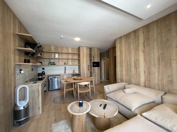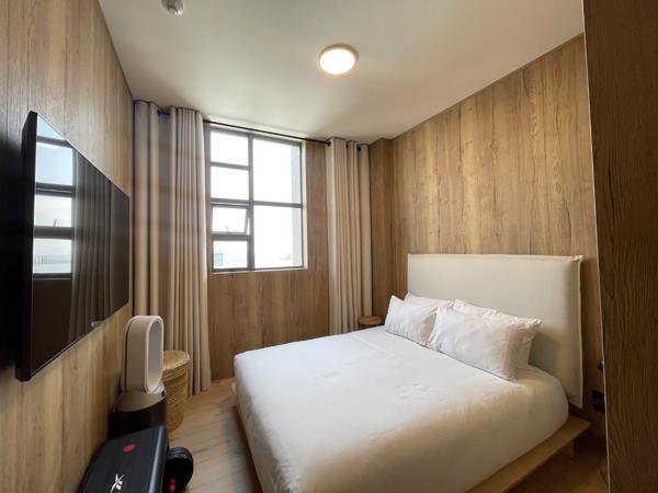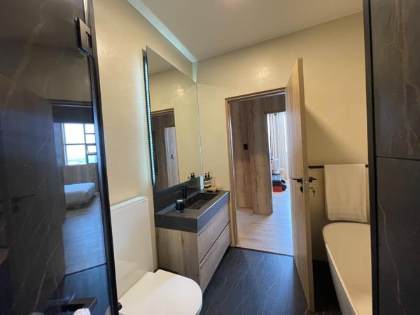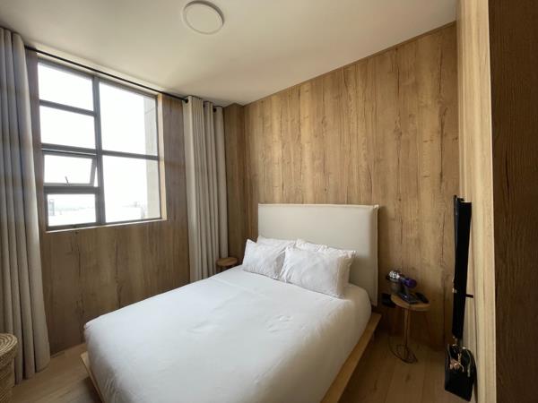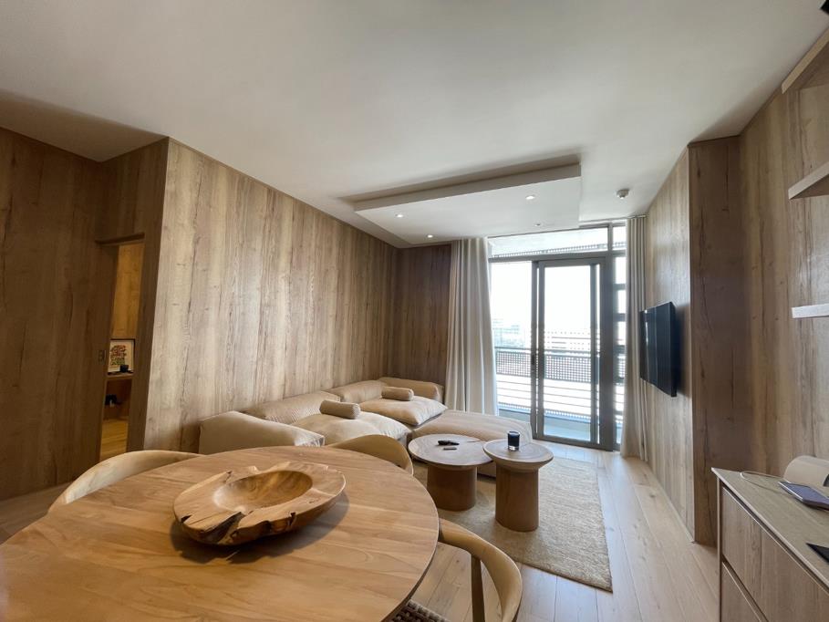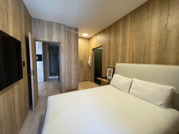 Discover contemporary living in this stylish 2-bedroom, 2-bathroom apartment located in the vibrant Rosebank area of Johannesburg. Boasting a modern, cohesive design with extensive natural wood finishes and flooring, this residence offers a sophisticated aesthetic. The open-plan layout seamlessly integrates the living, dining, and kitchen areas, creating an inviting and spacious atmosphere. Large sliding doors lead to a private balcony, flooding the interior with abundant natural light and offering scenic views.