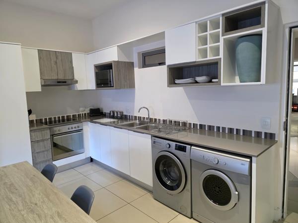 Stylish open-plan kitchen with high-end appliances (fridge, oven, microwave, washing machine & dryer)