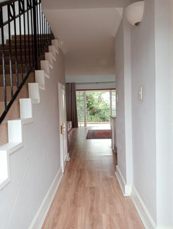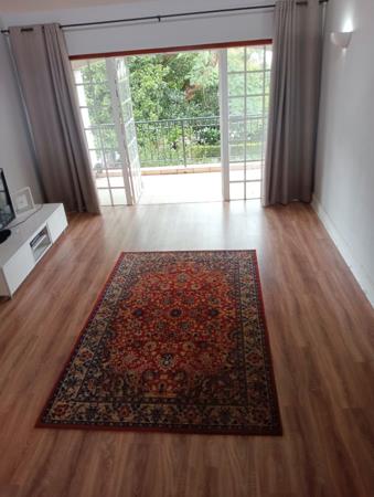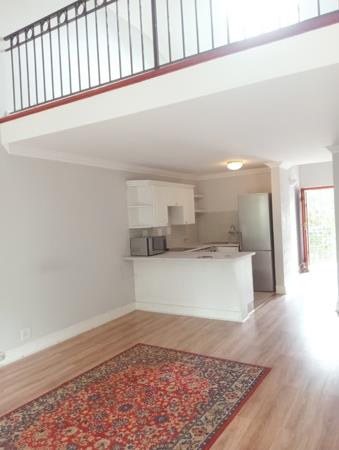 The kitchen flows seamlessly into the laminated open-plan living area, which can comfortably accommodate a TV lounge and a small dining space, depending on furniture size. Additional storage is conveniently located beneath the staircase. Sliding doors open onto a private balcony overlooking beautifully maintained communal gardens.