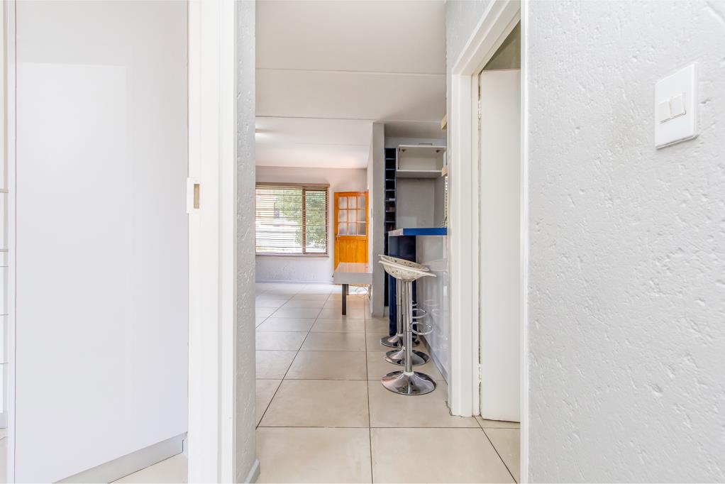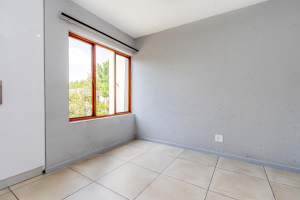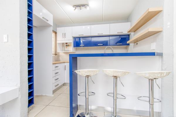 Think bold kitchen with pops of blue and white cabinetry. Open-plan flow made for easy living, and a private bricked balcony that just says weekend chill.