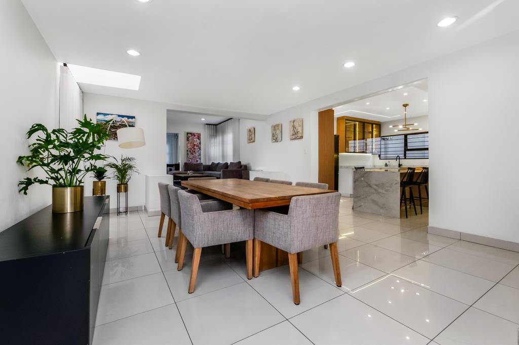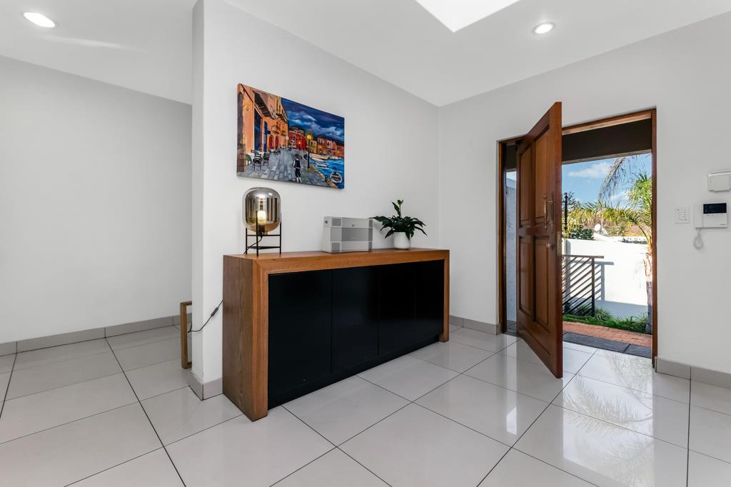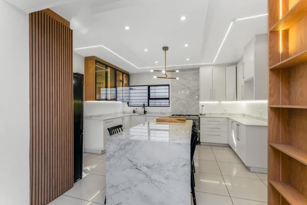 3.5 bed, 2.5 bath furnished house consists of 3 large tiled receptions, wood burning fireplace, beautifully presented leading onto a semi-covered patio and sparkling lovely pool in attractive garden with lawns. Open plan chefs kitchen with stunning marble tops, centre island with breakfast bar and built-in bar fridge. 5 plate Smeg gas hob with extra-large oven, and separate scullery accommodating 3 appliances. Main bedroom has full en suite bathroom, his and hers walk in dressing areas and the other two beds share a full bathroom. The small bedroom can be used as a study or WFH. Fibre ready, Cloak room, double automatic garage, two beds staff quarters, Huawei solar system and borehole with a 5000L backup water system.