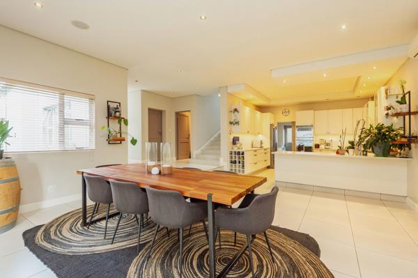 The TV lounge, complete with a cozy fireplace, provides a warm, inviting space for family living. Stacking doors from the dining area open seamlessly onto a covered patio overlooking a manicured garden, tranquil water feature, and sparkling swimming poolideal for effortless indoor-outdoor entertaining.