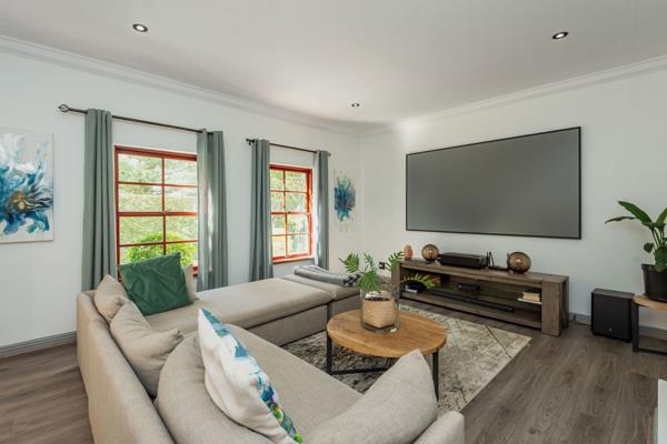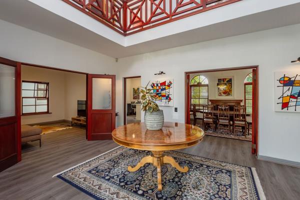 Downstairs features three open-plan reception areas that flow onto a generous covered patio with a built-in braai, overlooking a private garden and sparkling swimming poolideal for both entertaining and everyday family life.