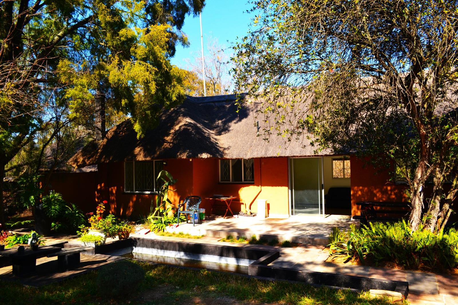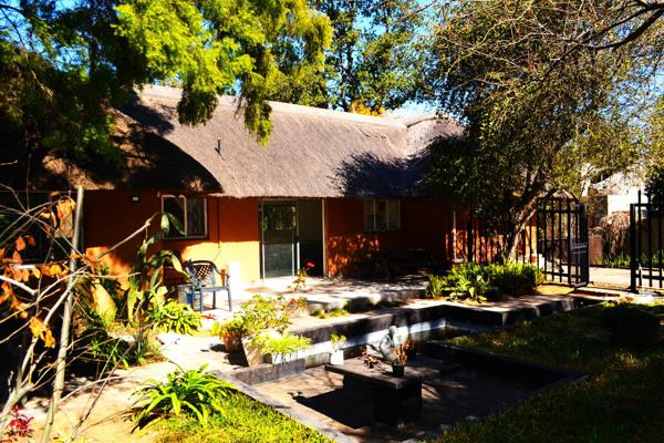 Quaint thatched garden cottage with private patio and wooden patio table bench