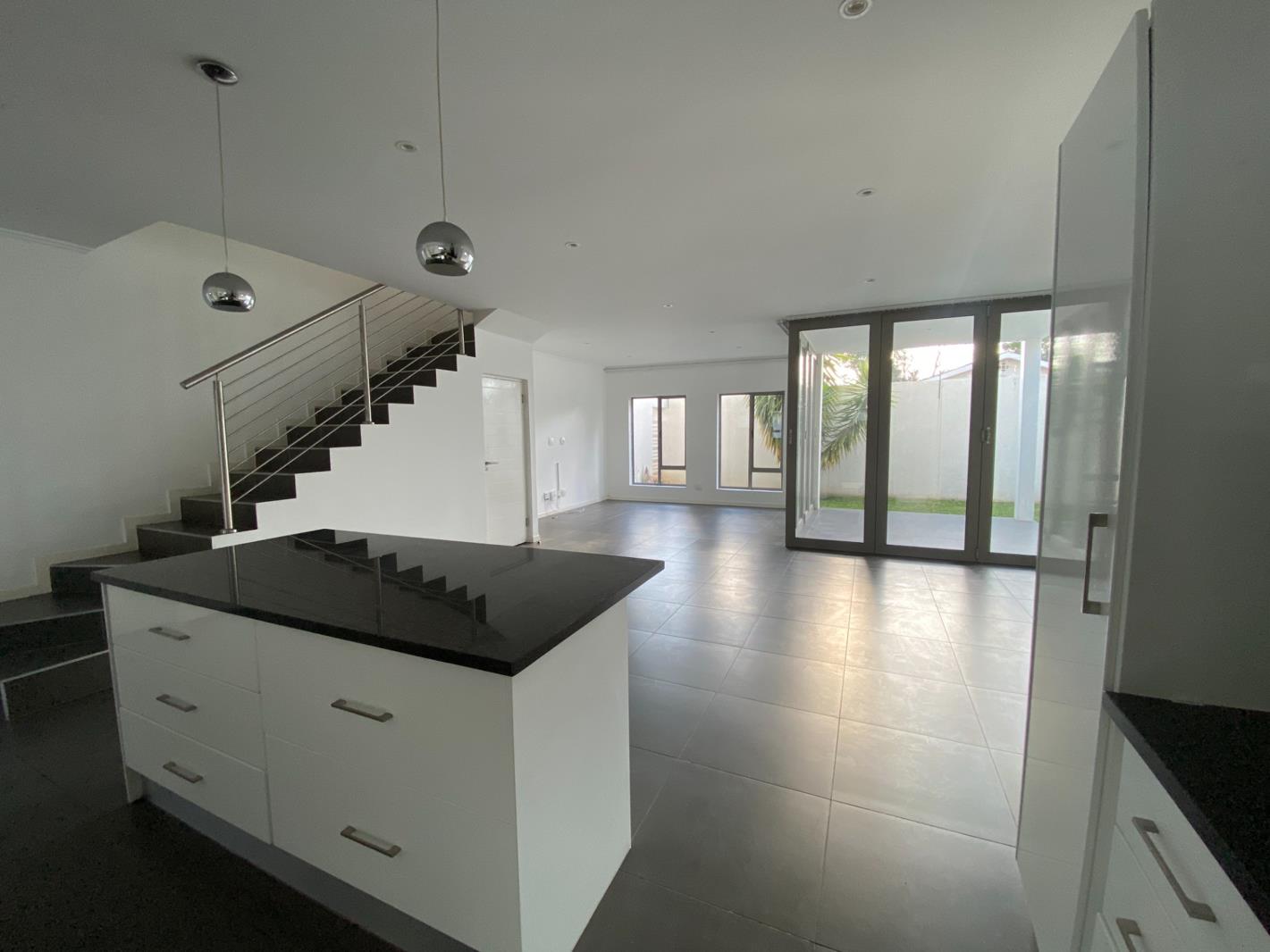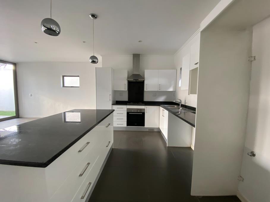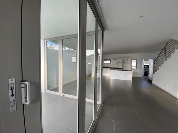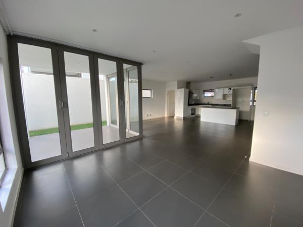 Large marble open plan kitchen open to dining room and lounge area which have 2 stacking open doors open to cover patio and garden