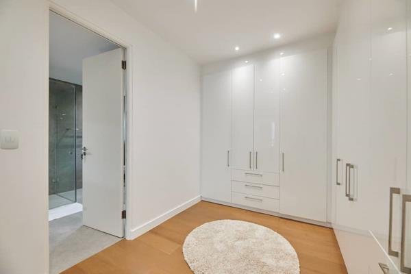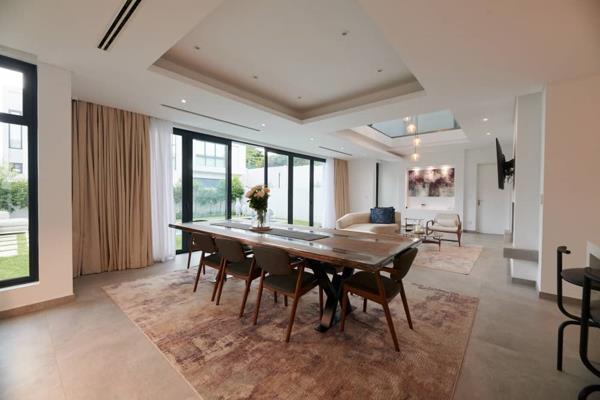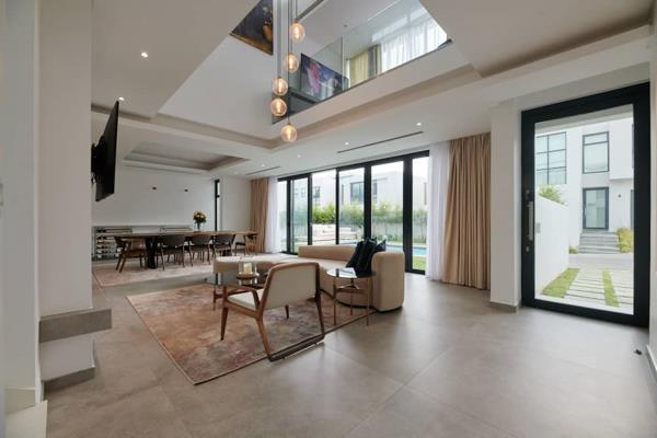 On entering one is met with a double-volume entrance lounge dining area with light coming in from all sides, due to the Skye lights and large floor-to-ceiling windows, coupled with a pillarless glass staircase. This sets the tone of the home which consists of a private studypyjama lounge, 3 reception rooms with a floating bar and fireplace, a private guest suite with access to the garden, and a magnificent covered patio with a built-in braai. This looks out to a pool and a modern landscaped garden.