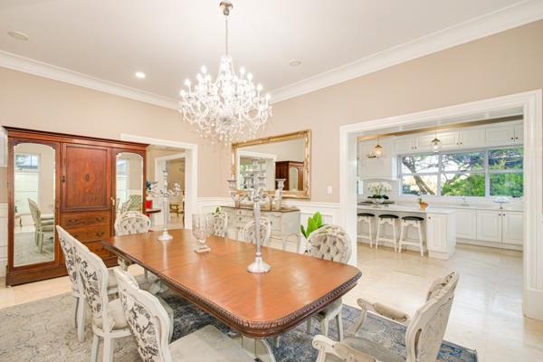 The kitchen is a culinary masterpiece, bathed in natural light and designed with impeccable taste. Featuring floor-to-ceiling white cabinetry and pristine marble countertops, it is equipped with state-of-the-art appliances, including a gas stove, two double ovens, and a central island with a breakfast bar. A fully fitted scullery complements this impeccable space.