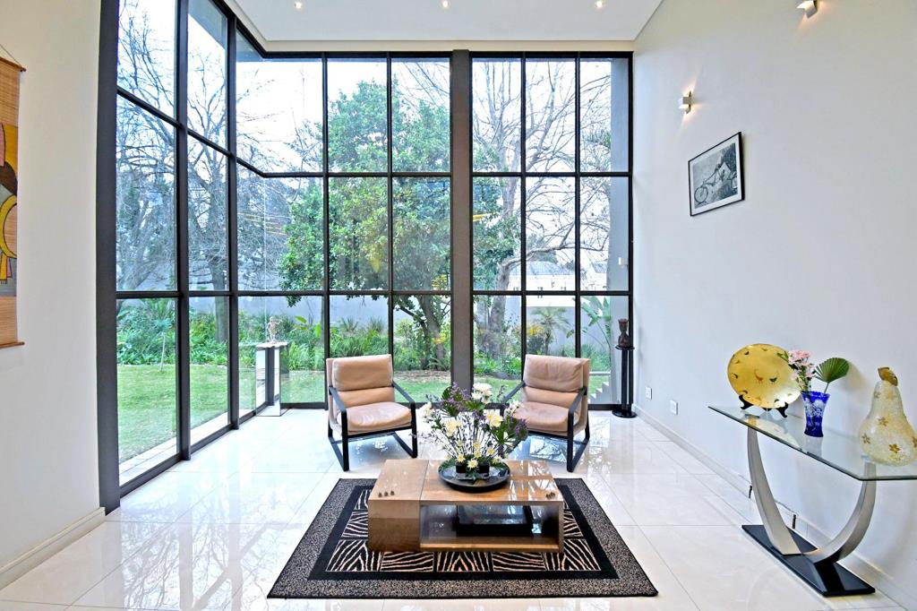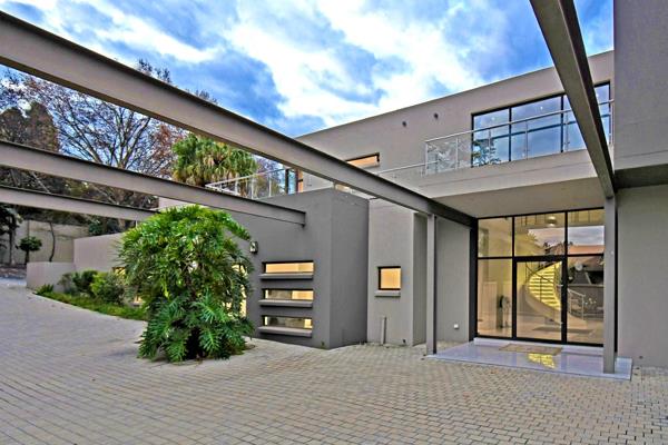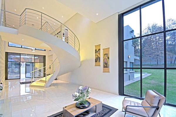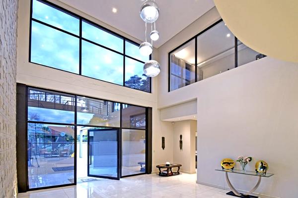 Set in arguably the most secure and peaceful enclave in Bryanston. Built on over an acre of elevated land, there are three floors of extensive accommodation with views of the Sandton skyline. The triple-volumed, glass-encased entrance foyer flows to 4 receptions, the gourmet open-plan kitchen and prep kitchen with scullery.