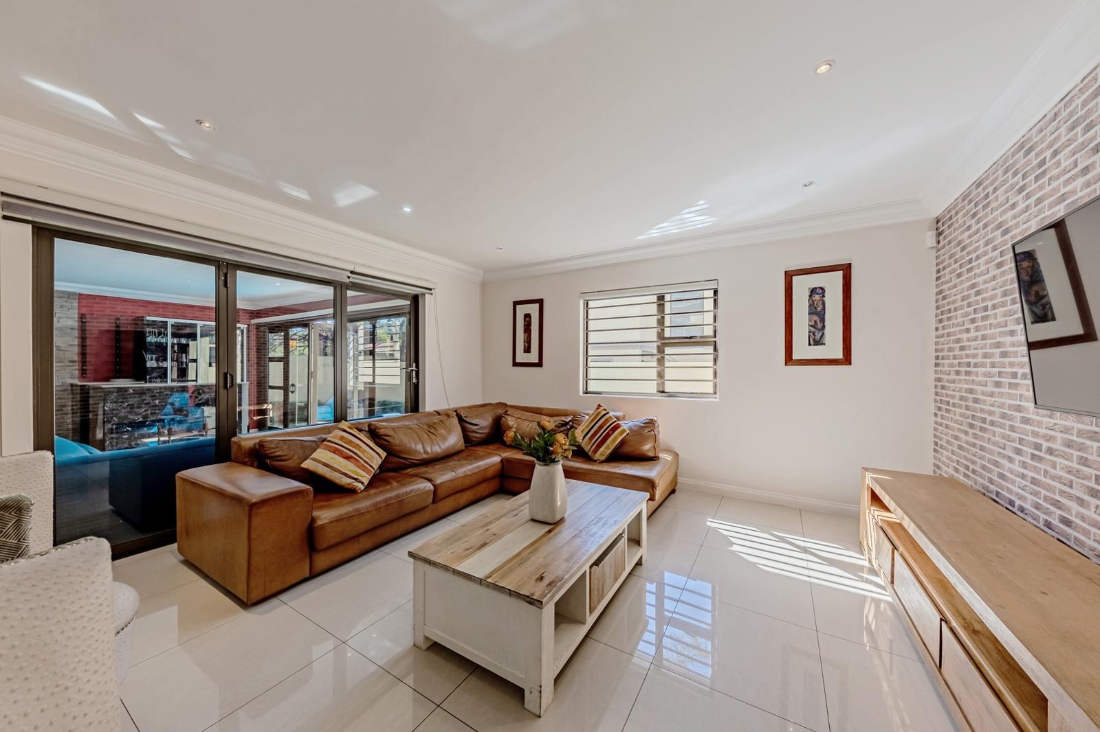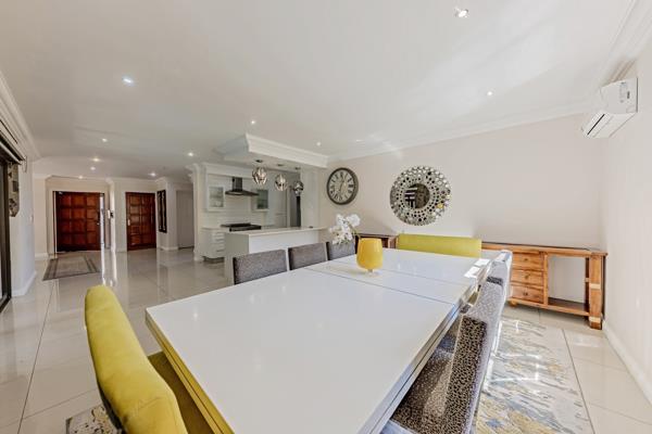 This exceptional 3-bedroom, 3.5-bathroom residence offers modern open-plan living in a sought-after Bryanston estate. The expansive living areas feature bright white tiled floors, recessed lighting, and elegant crown molding, creating a sophisticated atmosphere. Large sliding glass doors seamlessly connect the lounge to an adjacent entertainment area, while a decorative brick-effect wall adds character.