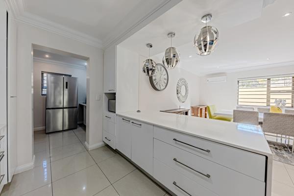 The contemporary kitchen boasts sleek white cabinetry, a subway tile backsplash, stainless steel appliances, and a central island, flowing effortlessly into the spacious dining area, complete with an air conditioning unit and stylish accent wall. Each of the three bedrooms benefits from its own en-suite bathroom, providing ultimate privacy and comfort. A convenient guest toilet is also available. The property further includes staff quarters and ample storage space, catering to all practical needs. Enjoy year-round comfort with air conditioning and a cozy fireplace, perfect for cooler evenings. An integrated built-in bar enhances the home''s entertainment potential. Step outside to discover a private oasis featuring a refreshing pool, a spacious patio, and a deck, ideal for outdoor entertaining and relaxation. The well-maintained garden and built-in braai area offer perfect settings for family gatherings. With two garages and three total parking spaces, convenience is assured. Pets are welcome, making this a true family home.