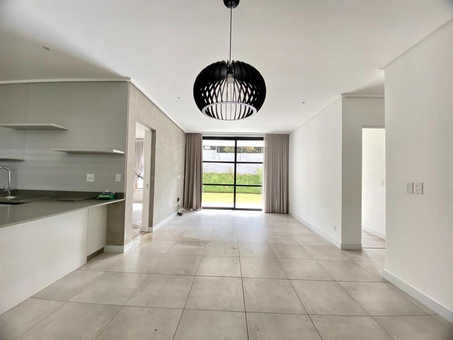 Situated in Bryanston, this residence features a stylish open-plan layout that seamlessly connects the lounge, dining area, and a designer kitchen fitted with premium integrated Smeg appliances, including a 4-plate gas hob, extractor, and double eye-level electric oven. Ambient lighting enhances the modern atmosphere and sense of space.