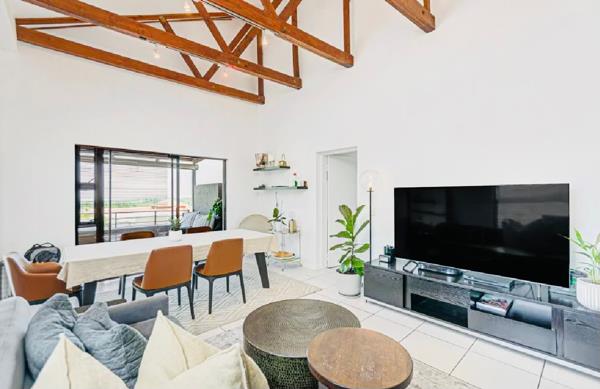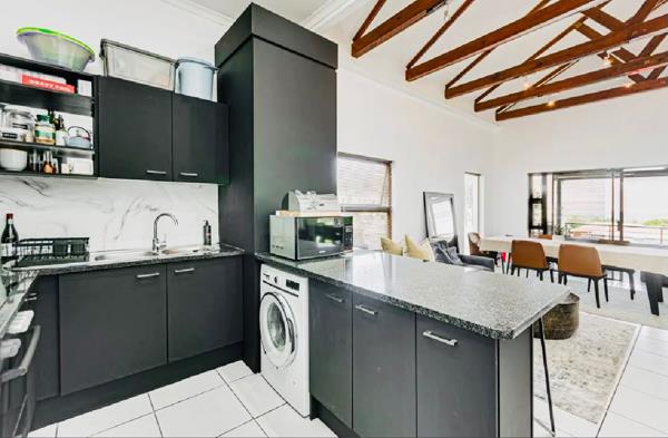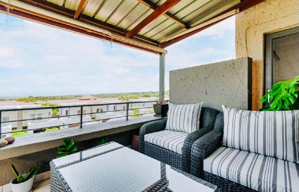 Stylish apartment in most desirable location Bryanston. North facing with breathtaking view of Magalisburg .Specious apartment,this unity is the best positioned at the complex .Open plan living area comprising of well equipped kitchen with 2 appliances ,4 seater dinning room and 2 good size bedrooms. 2 parking ,pool,table,outsite sitting area,communal,braai space.Close to shopping centre . Prepaid electricity. Built cupboards and wadrobes .