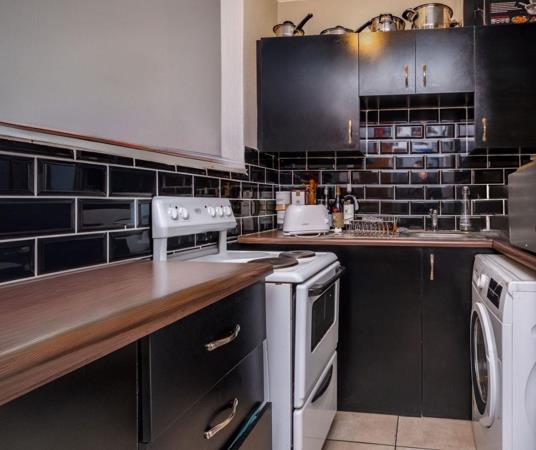 The apartment features an efficient, open-plan layout that seamlessly integrates the living, sleeping, and kitchen areas. The entire space is finished with durable, easy-to-maintain tiled flooring, ensuring a clean and modern aesthetic throughout. The kitchen is a standout feature, equipped with sleek black cabinetry, a practical wood-look laminate countertop, and a striking black subway tile backsplash. Included appliances are a washing machine and a freestanding cooker, complemented by a convenient breakfast bar ideal for casual dining. The compact, functional bathroom maintains the stylish look with classic black subway tiling, a pedestal sink, and a bath featuring an integrated shower. A comfortable lounge area provides ample space for relaxation and extends directly onto a private balcony, offering scenic views of the surrounding area.