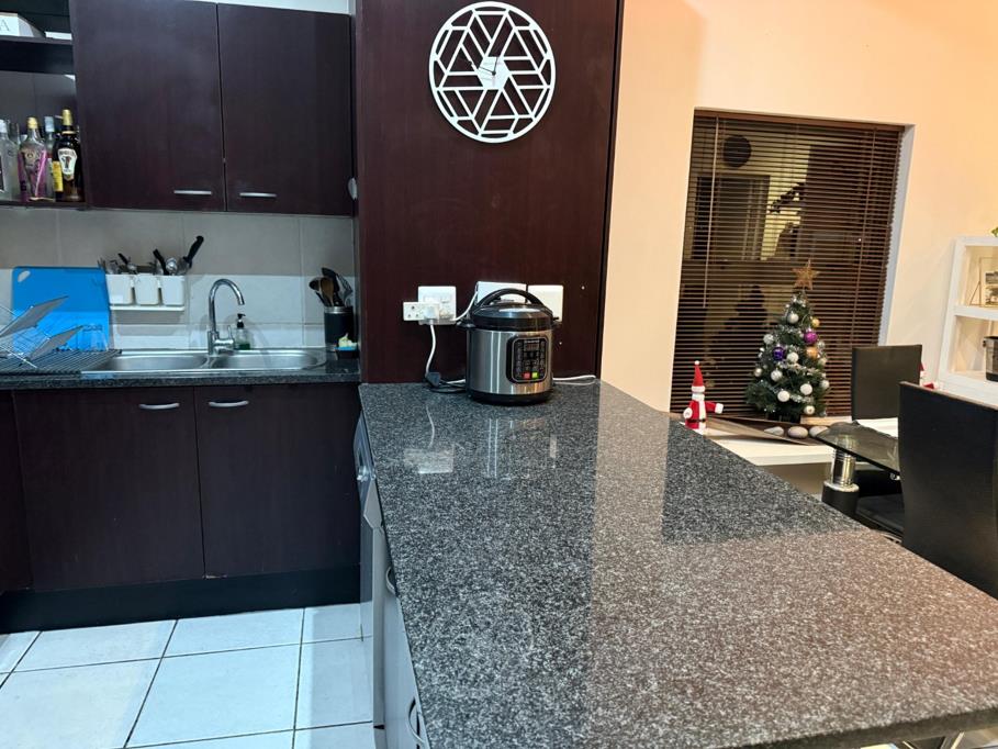 The living area is designed for effortless modern living, with a well-appointed kitchen that includes space for two appliances and connects seamlessly to a dining area that comfortably fits a four-seater table. Both bedrooms are generously sized and fitted with excellent cupboard space, offering a calm retreat at the end of the day. The main bedroom includes a full en-suite bathroom with both a bath and shower, and also opens onto a covered patio perfect for quiet mornings or relaxed evenings outdoors.