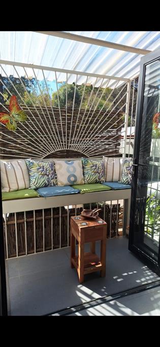 8 steps up from the frontyard area. The 8 steps lead to a private covered and secured patio with a bench and folding stacking aluminium door to the tiled lounge. The far side of the lounge features another balcony as well, with large aluminium French doors. When all glass doors are open ,the lounge area feels like a huge patio overlooking trees from all sides. At the entrance one finds 2 meters of built in cupboards.
