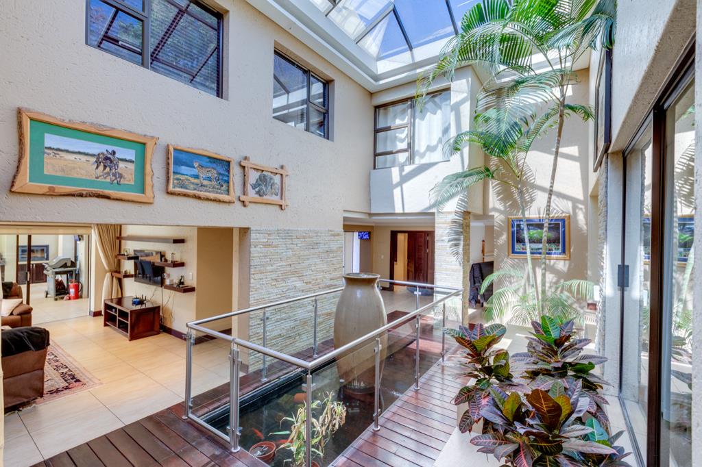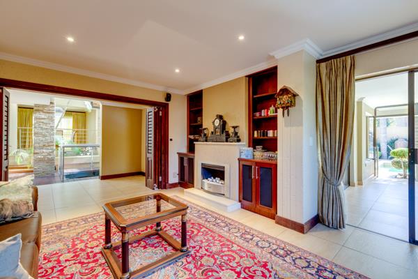 Upon entering, guests are welcomed into a serene entrance hall with an interior atrium, anchored by a gently cascading indoor fountain, bathed in soft light from a skylight above. This fountain brings an element of calm and brings the outdoors in. Beyond the atrium lies the formal lounge, adorned with a grand fireplace, aluminium windows and doors an ideal setting for elegant entertaining or peaceful evenings.
