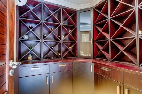 The wine cellar is climate-controlled and styled with dark wood racking, providing ample storage for an extensive collection. Its refined, understated ambiance is perfect for collectors and connoisseurs alike.