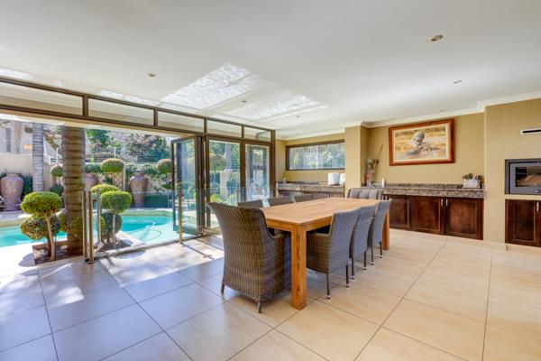 The enclosed patio serves as a year-round retreat, now enclosed with aluminium stack-back doors that open fully to the outdoors. Furnished for comfort and flexibility, this space is ideal for relaxed gatherings, indoor-outdoor living, or peaceful afternoon retreats.