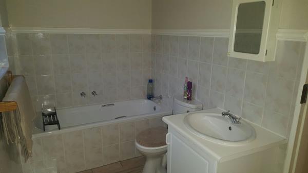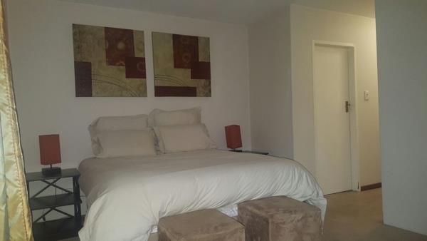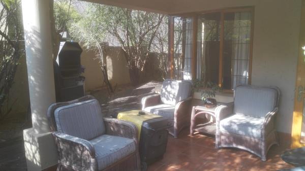 Spacious modern kitchen. Upstairs main bedroom with en suite bathroom (bath and shower) air con and private patio, second bedroom en suite with bath. Third bathroom with shower. Patio with wooden deck and built-in braai. Secure complex, 24 hour security. Unit with alarm system.