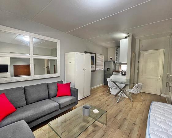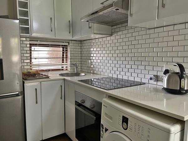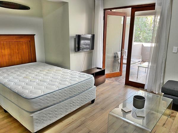 Cute furnished middle-floor studio apartment, measuring 46m2, in a riverside country setting, but within easy reach of the Rivonia Road route into the Sandton CBD.
