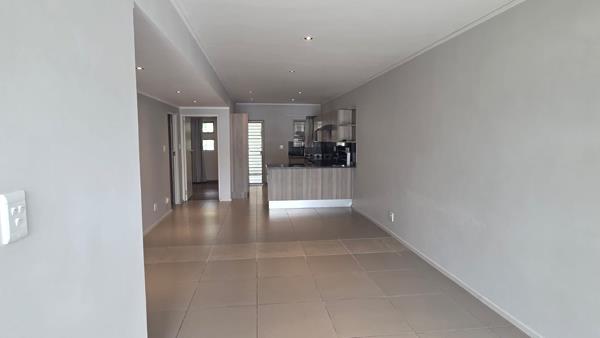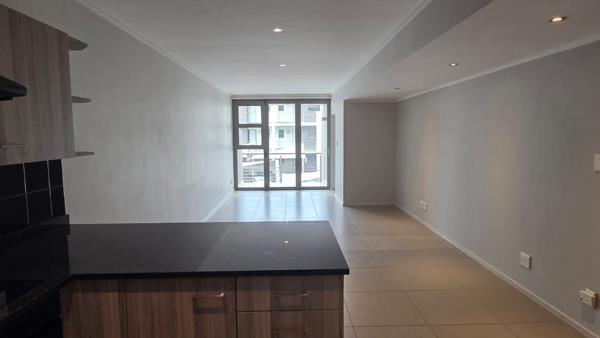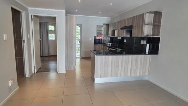 This modern apartment in Edenburg, Sandton, offers a sophisticated rental opportunity with two bedrooms and two bathrooms, including one en-suite. The interior boasts a contemporary open-plan design, seamlessly connecting the living area with a well-appointed kitchen. The kitchen features stylish wood-grain cabinetry, sleek black countertops, a convenient breakfast bar, and integrated spaces for washing appliances, complemented by a built-in hob and extractor fan. Throughout the main living spaces, durable tiled flooring and recessed ceiling lighting create a bright and inviting atmosphere, enhanced by good natural light.