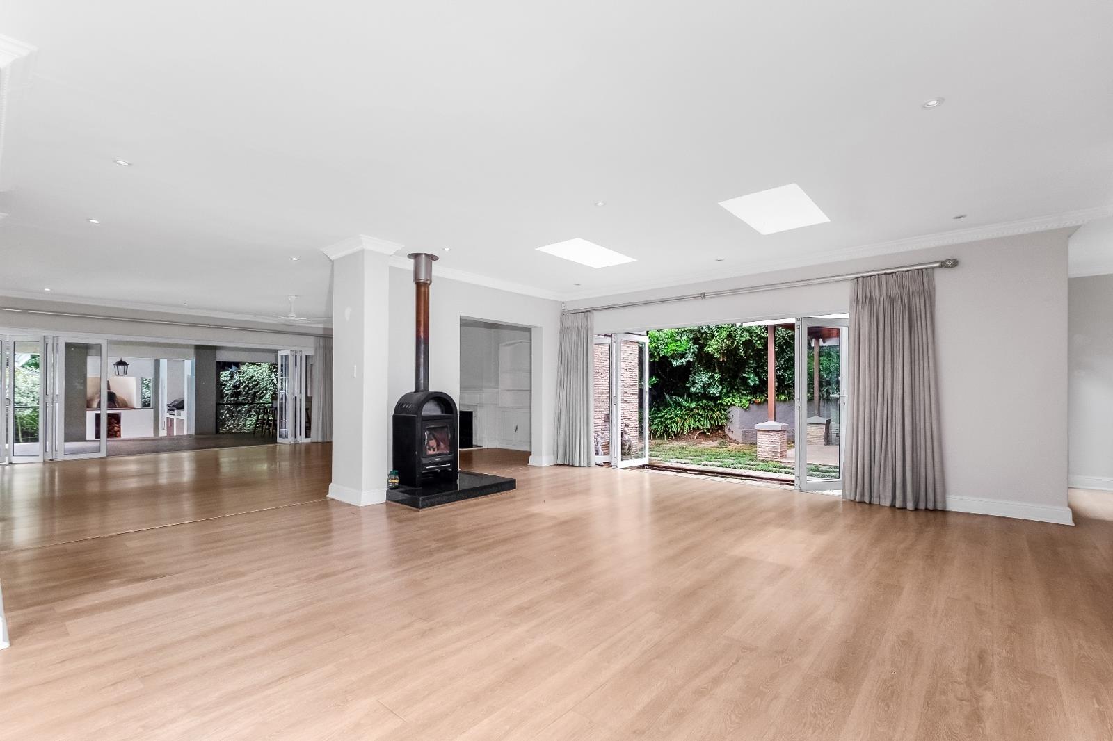Super spacious living and receptions areas plus study. Plenty of natural light, double volume pitched ceilings with white wooden beams. Contemporary easy living, relaxed, modern and stylish. Polished wooden floors thoughout. Curtains and blinds included.