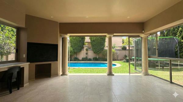 Downstairs, the home offers generous open-plan reception rooms that include a lounge, dining area, and a large enclosed entertainment patio framed by elegant columns. Full-height sliding doors open effortlessly to the manicured garden and the sparkling blue swimming pool, creating the perfect setting for family enjoyment and year-round entertaining.