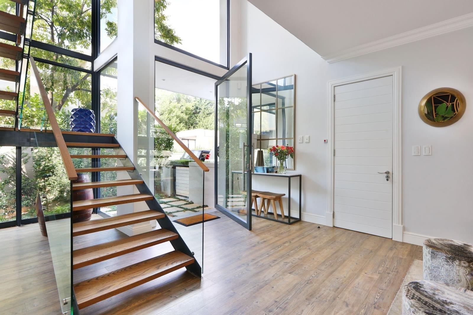 Discover an unparalleled lifestyle in this exquisite contemporary residence, perfectly situated within a secure complex in the prestigious Hyde Park, Sandton. This architectural masterpiece welcomes you with a grand double volume entrance hall featuring soaring ceilings, abundant natural light and a striking floating wooden staircase with elegant glass railings that immediately sets the tone for sophisticated luxury.