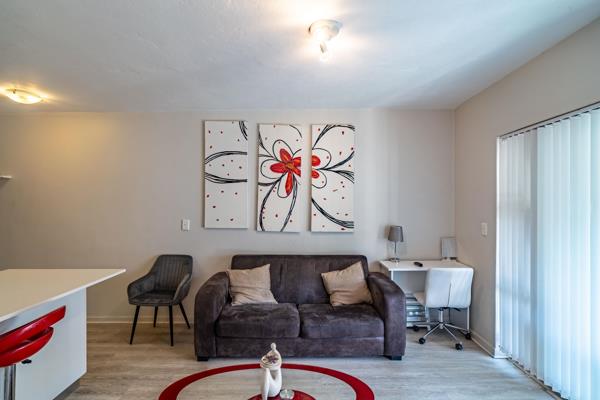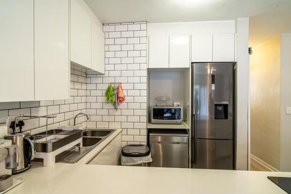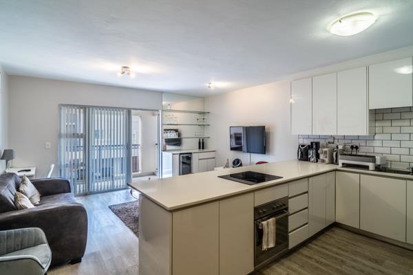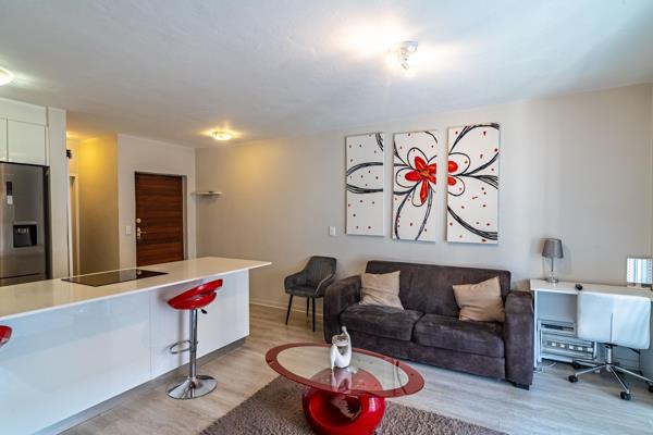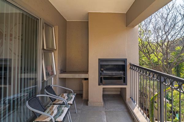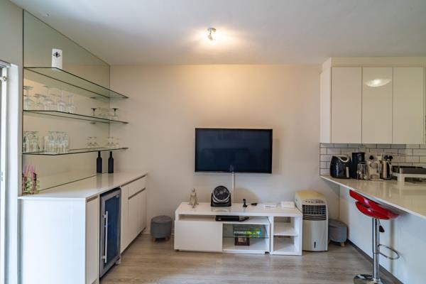 This opens up onto the spacious living area with a built-in bar area accented with a mirror to open the space up. Additionally, the living area flows onto a private and spacious balcony with built-in braai.