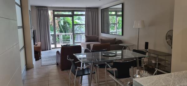 The spacious lounge opens onto a large private balcony, perfect for entertaining guests or enjoying a relaxing evening with a braai. Security is paramount, with a guarded entrance and secure basement parking providing peace of mind.