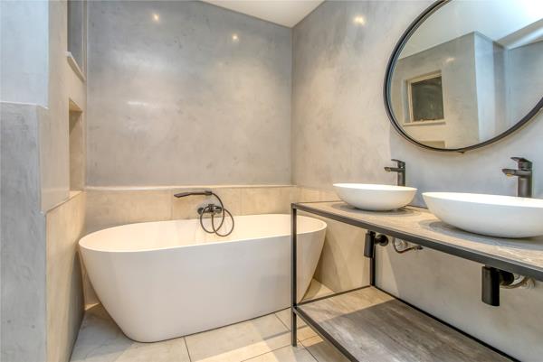 The en-suite bathroom has an elegant oval bath wrapped in sleek black stainless-steel accessories modern, elevated and beautifully crafted.