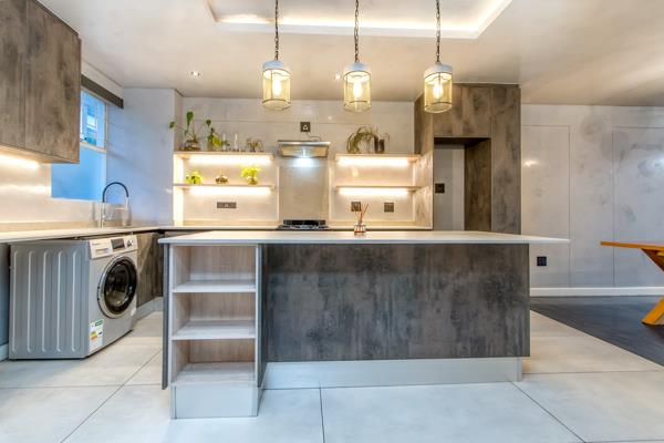 Venetian-plastered, Caesarstone counter tops and overhanging black stainless-steel lantern lights drop for a dose of moodiness. The gas stove, black gloss cabinetry, soft-close cabinetry and under counter lighting complete this kitchen thats as functional as it is striking.