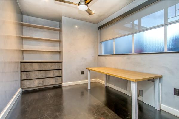 This first bedroom features built-in shelving and drawers, ideal for a workspace, guest room or creative studio.