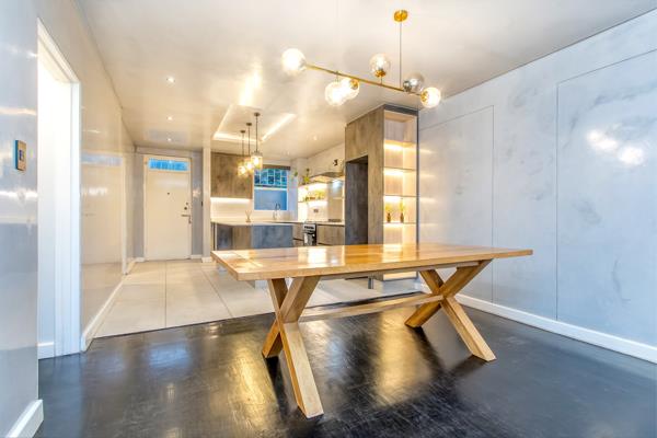 Black parquet flooring flows throughout this apartment, giving every room richness and soul.