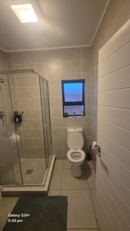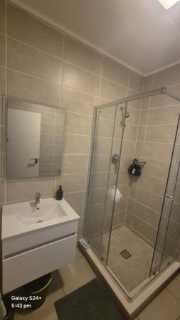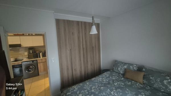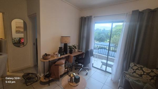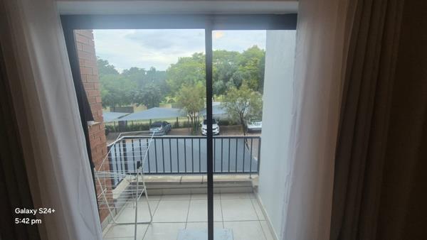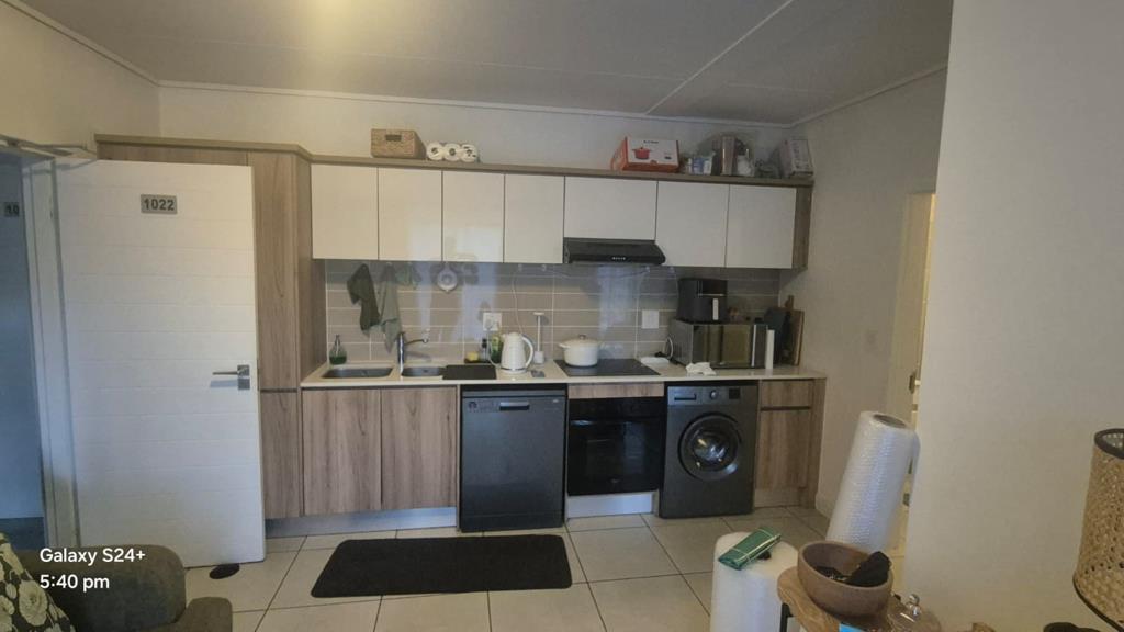 Open plan living area with balcony. Modern kitchen with Caesar stone surfaces and silver appliances.