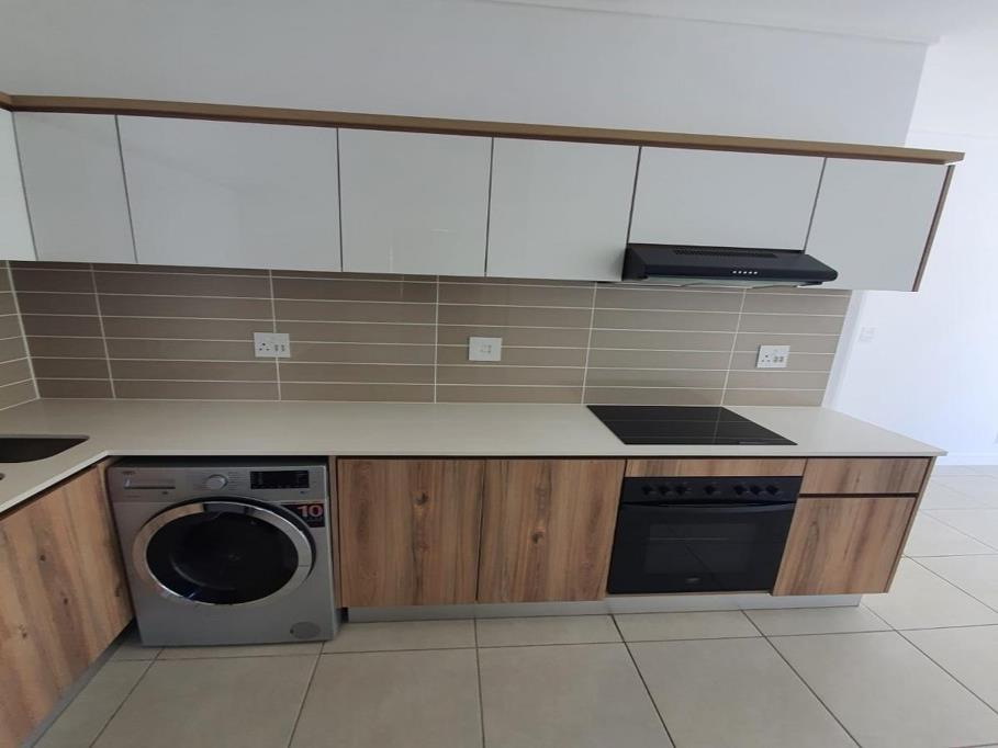 Open plan kitchen with lots of cupboard space and apartment has kitchen appliances.