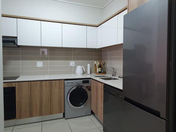 The neat open-plan kitchen boasts quartz countertops, an electric stove, an extractor fan, and ample built-in cupboards. Integrated appliances include a fridge, dishwasher, and washing machinetumble dryer.